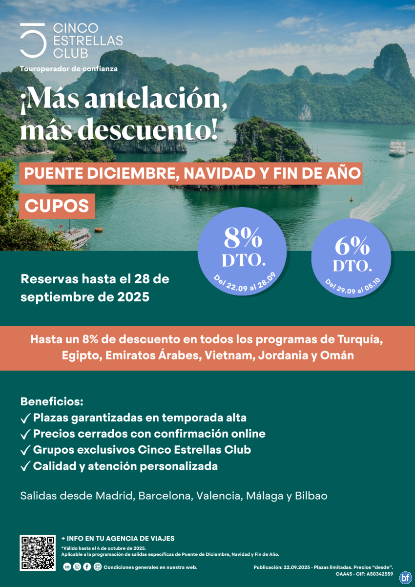 Cupos| 8% dto hsta 28.09 - Pte Diciembre, Navidad y Fin Año Egipto,Emiratos,Vietnam, Jordania y Omán